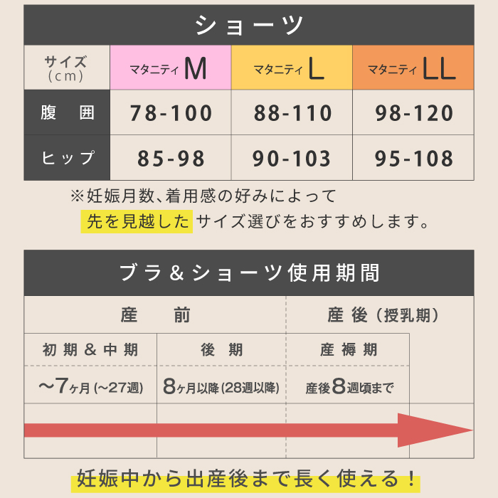 足ぐりはソフトタイプの光沢テープが、シンプルでも目を惹くシックなデザイン。クロス形状のベルトが特徴のウエストベルトは、ゴムを使用せずパワーネットを身生地で包んだ広幅タイプ。大きくなるお腹に面でソフトフィットし、身体にやさしい仕様です。浅履きタイプのショーツなので、みぞおちあたりの不快な締めつけから解放され楽ちん。健診のエコー時にもスムーズです。産前・産後と計算されたウエストラインでフロントをすっきり見せ、後はヒップをすっぽり包む安定感のあるバックスタイル。洗濯ラベルは直接肌にあたらないフロントクロス位置に縫い付けています。。