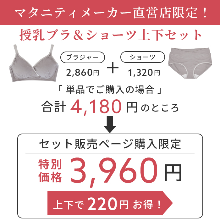 肌にやさしい綿ベア天竺を使用した授乳ブラとショーツの上下セット。マタニティメーカー直営店限定で単品で購入するよりセットのほうがお買い得です。