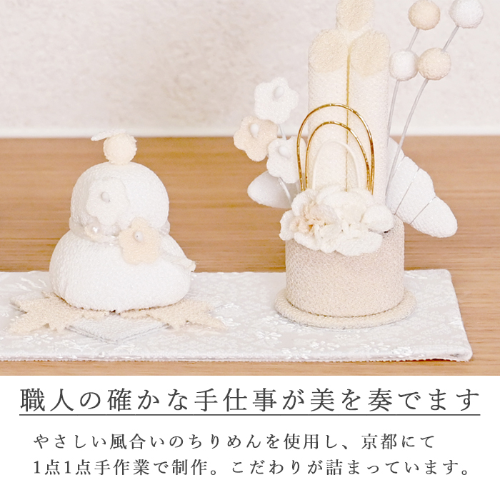 安心の日本製、京都の職人の手づくりによる、機械では再現できない繊細な仕上がりが、節句飾りとしての品格を高めます。仕上がりや表情に個体差がございますが、手仕事ならではの温かみとしてお楽しみください。