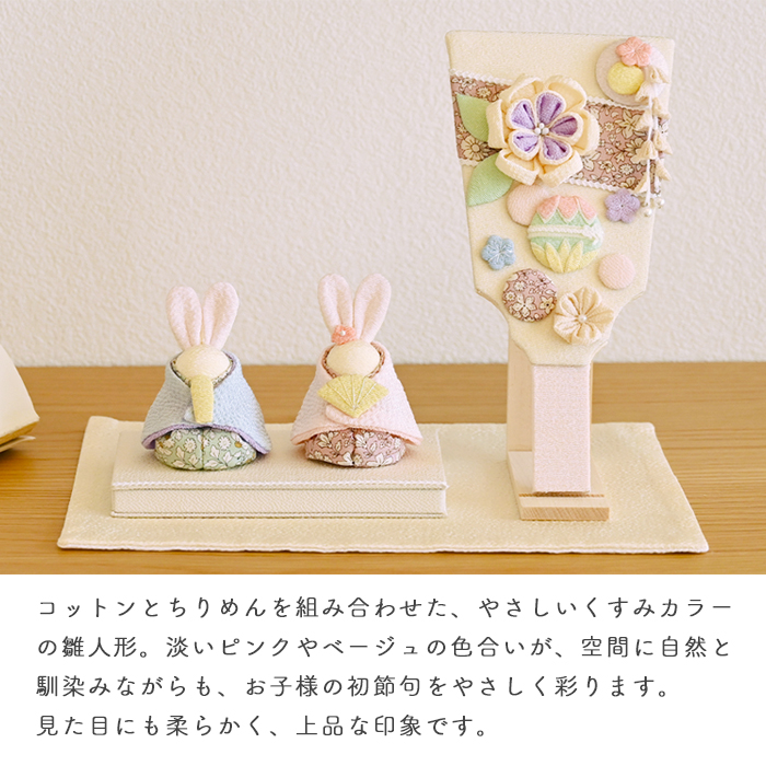 コットンとちりめんを組み合わせた、やさしいくすみカラーの雛人形。淡いピンクやベージュの色合いが、空間に自然と馴染みながらも、お子様の初節句をやさしく彩ります。見た目にも柔らかく、上品な印象です。