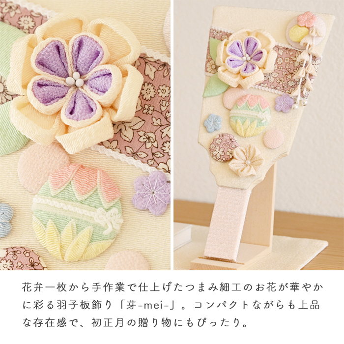 花弁一枚から手作業で仕上げたつまみ細工のお花が華やかに彩る羽子板飾り。コンパクトながらも上品な存在感で、初正月の贈り物にもぴったり。
