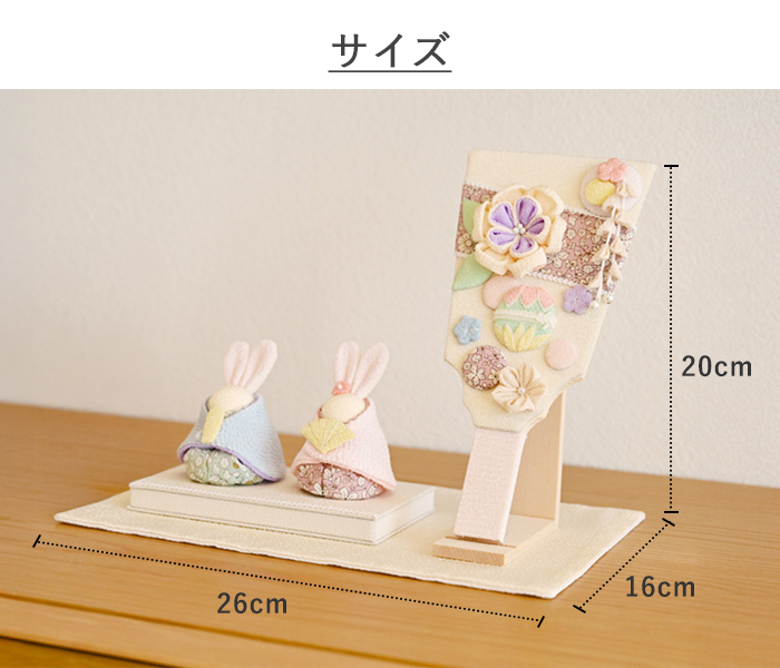 お雛様とお内裏様は、うさぎをモチーフにした愛らしい造形。ふんわりと淡いパステルカラーの衣装がやさしく調和し、落ち着いた雰囲気の中にも華やかさが感じられます。動物モチーフならではの親しみやすさがあり、お子様にも喜ばれるデザインです。