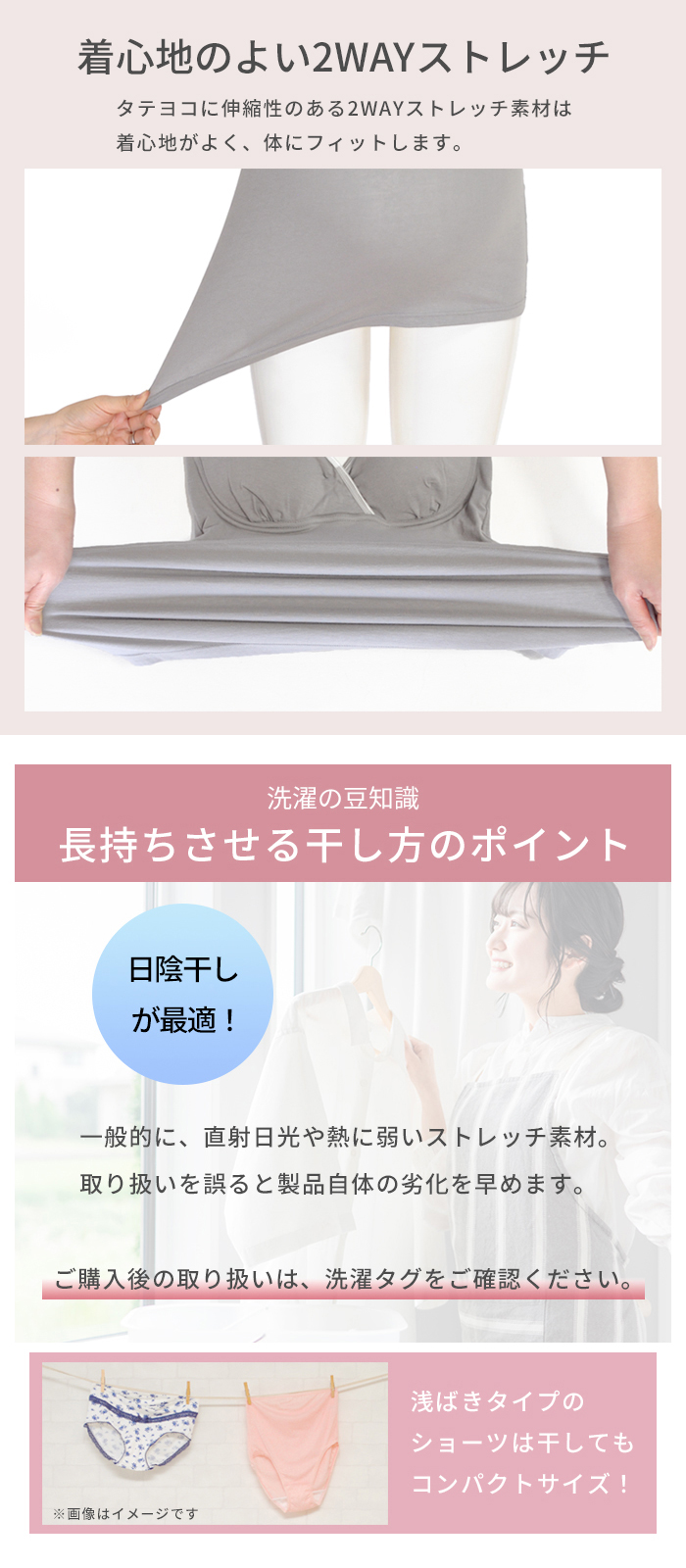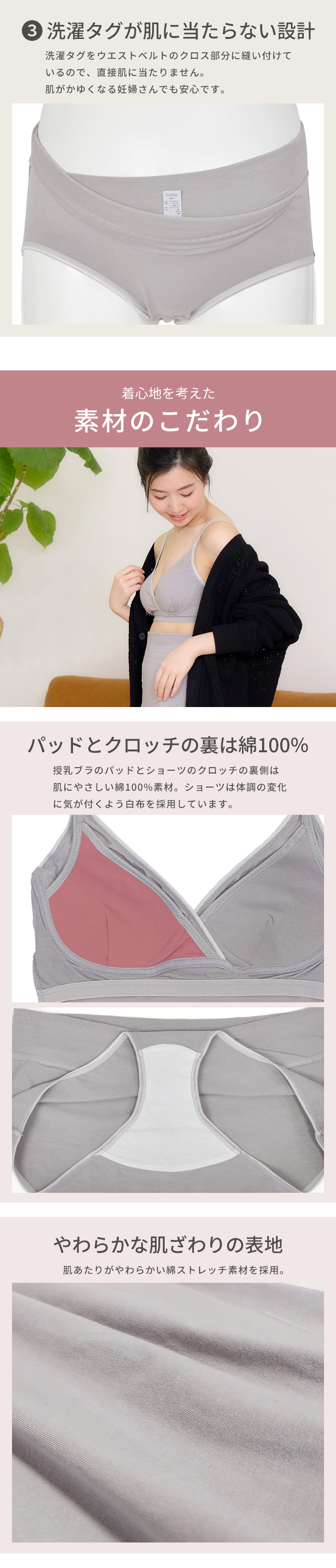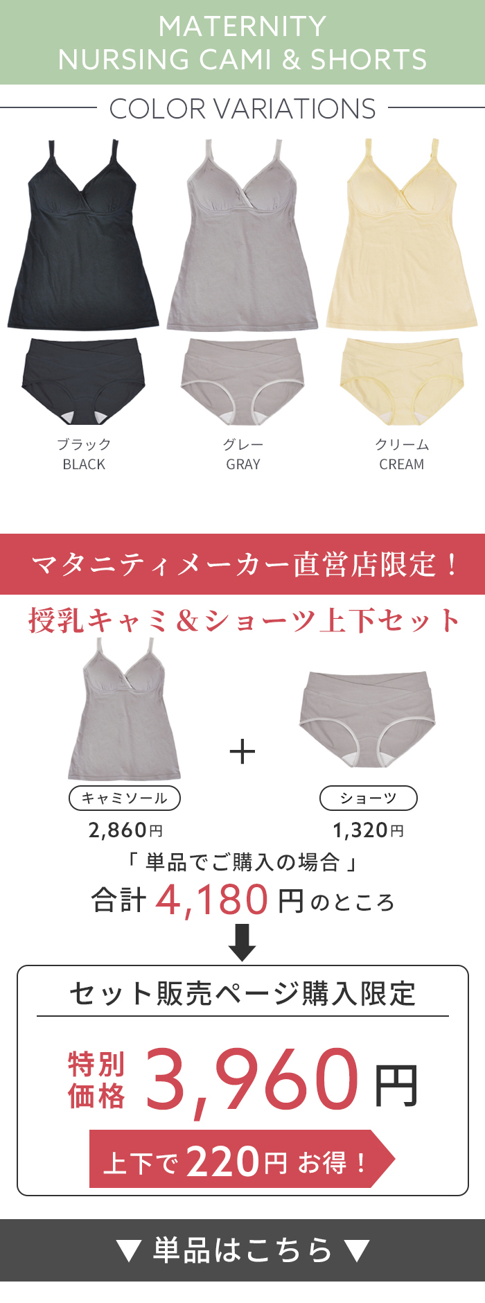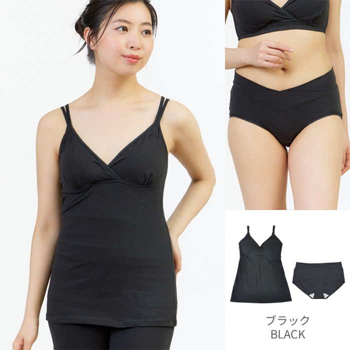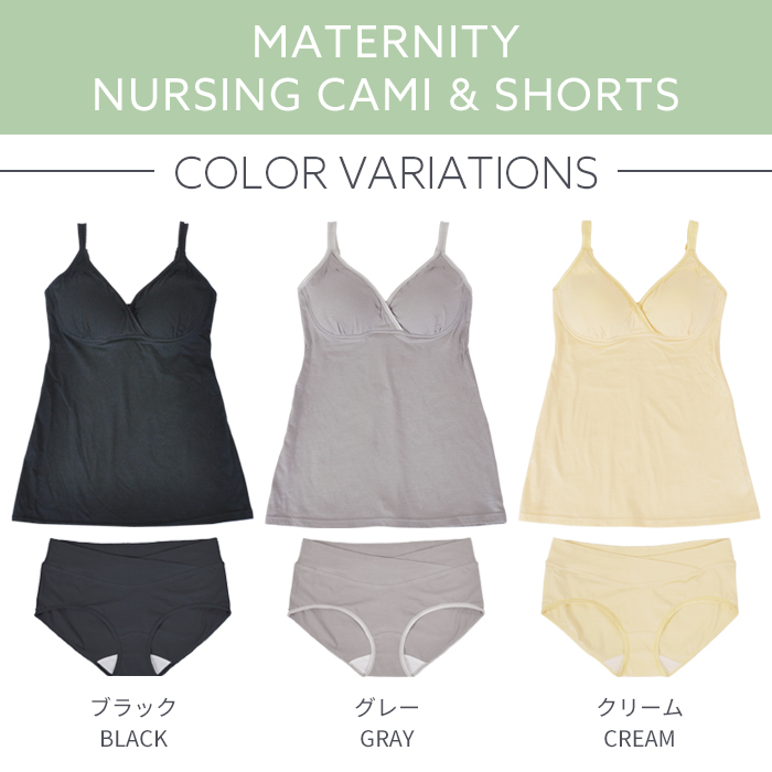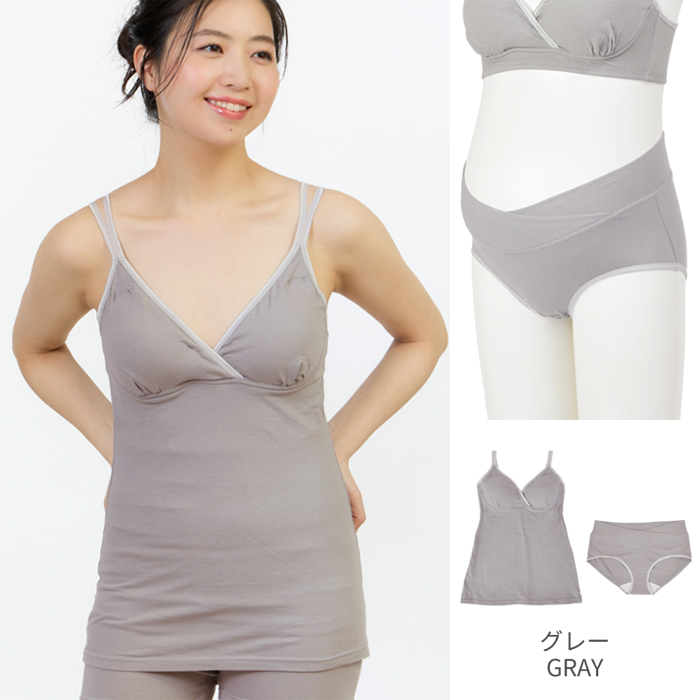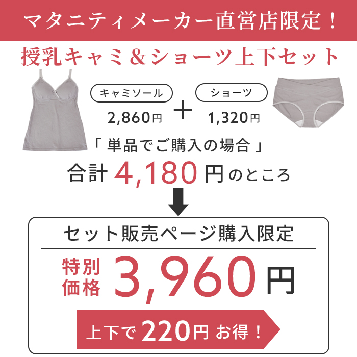 肌にやさしい綿ベア天竺を使用した授乳キャミとショーツの上下セット。マタニティメーカー直営店限定で単品で購入するよりセットのほうがお買い得です。