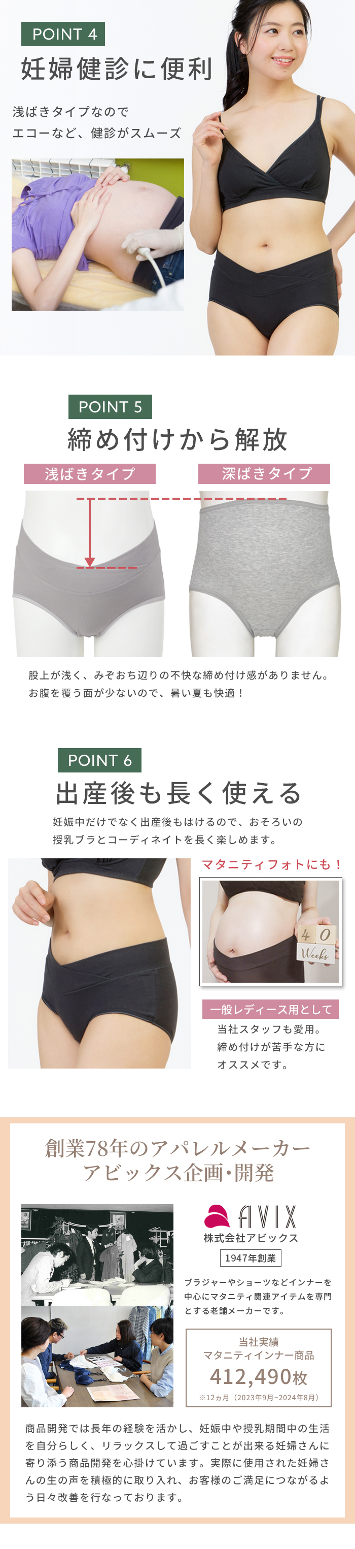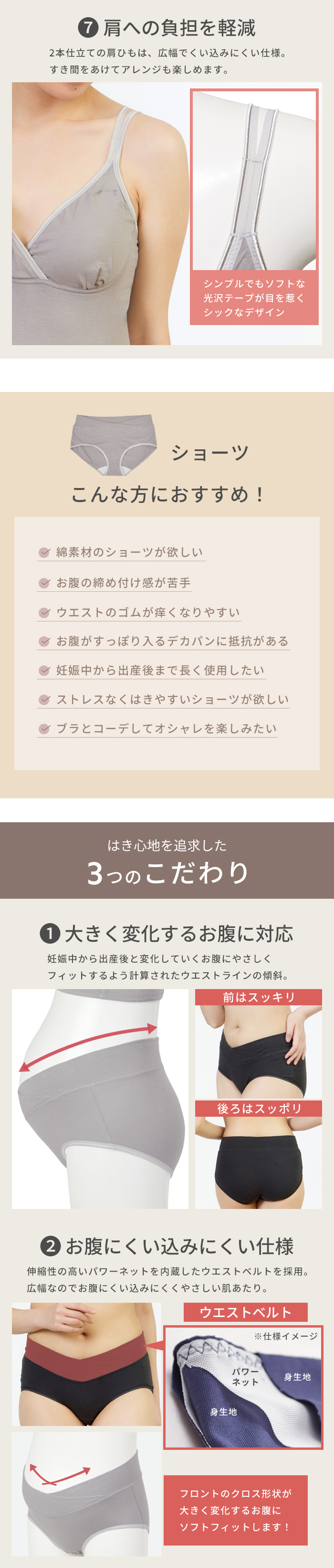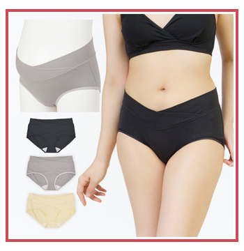 足ぐりはソフトタイプの光沢テープが、シンプルでも目を惹くシックなデザイン。クロス形状のベルトが特徴のウエストベルトは、ゴムを使用せずパワーネットを身生地で包んだ広幅タイプ。大きくなるお腹に面でソフトフィットし、身体にやさしい仕様です。浅履きタイプのショーツなので、みぞおちあたりの不快な締めつけから解放され楽ちん。健診のエコー時にもスムーズです。産前・産後と計算されたウエストラインでフロントをすっきり見せ、後はヒップをすっぽり包む安定感のあるバックスタイル。洗濯ラベルは直接肌にあたらないフロントクロス位置に縫い付けています。