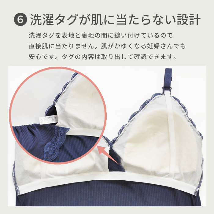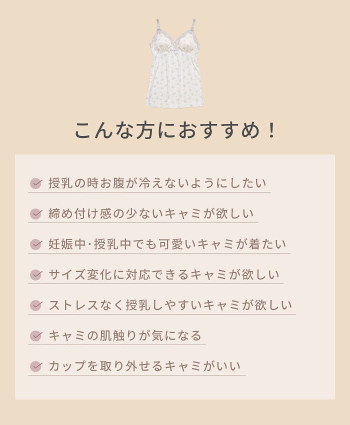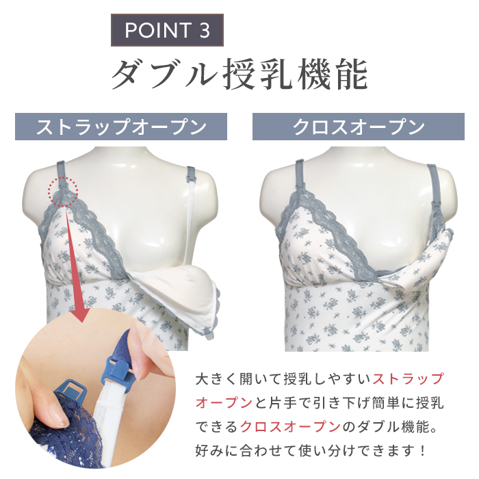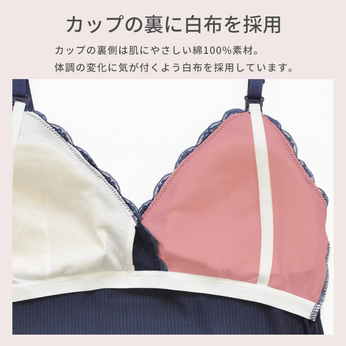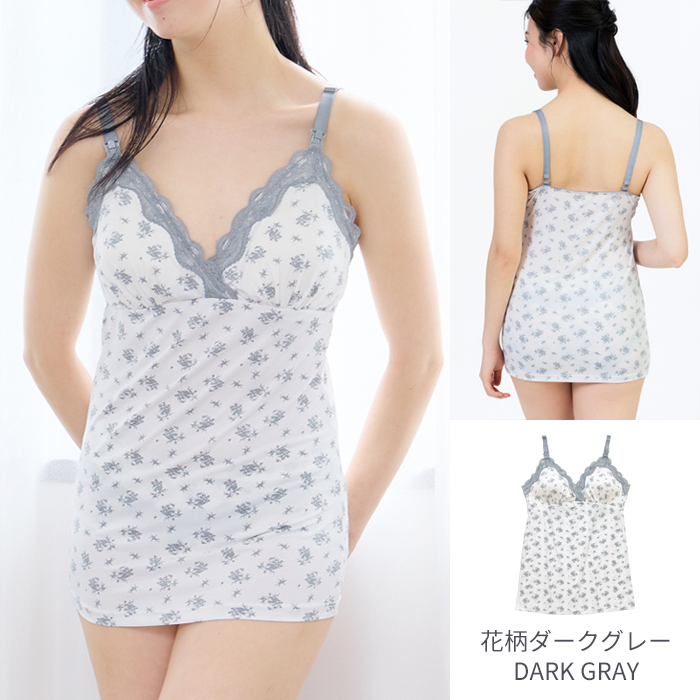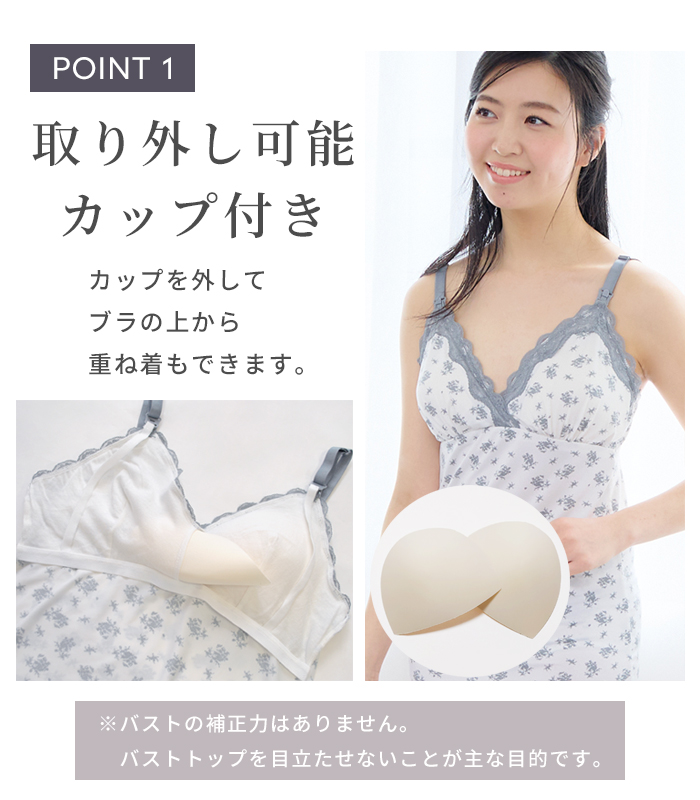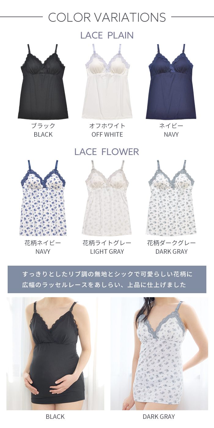 すっきりとしたリブ調の無地とシックで可愛らしい花柄にラッセルレースをあしらった上品な印象の授乳キャミソール。授乳機能は、ストラップオープンとクロスオープンの2通り可能。取り外し可能なカップ付きです。アンダーはフロント部分にゴムが入り、ストラップの丈調節も可能なのでボディにやさしくフィット。臨月も安心な着丈で、ボトムインにも快適なすっきりシルエットです。肌寒い時期の授乳ではお腹が冷えないので便利です。カップを取り外しブラの上から重ね着使いも可能。通年で体温調節にお使い頂けるアイテムです。