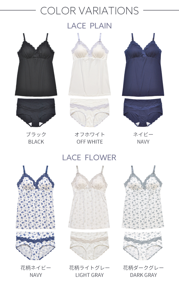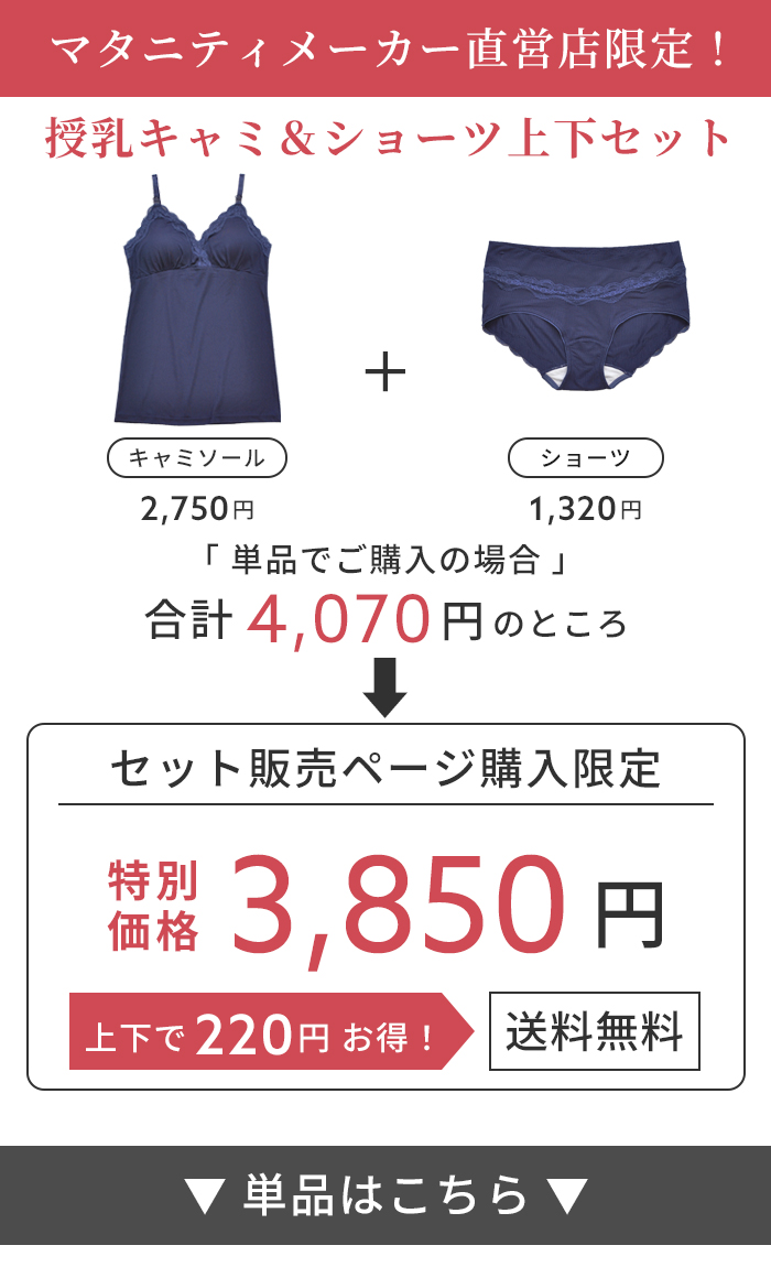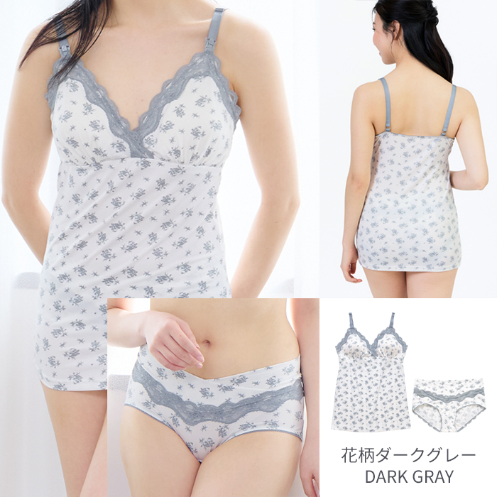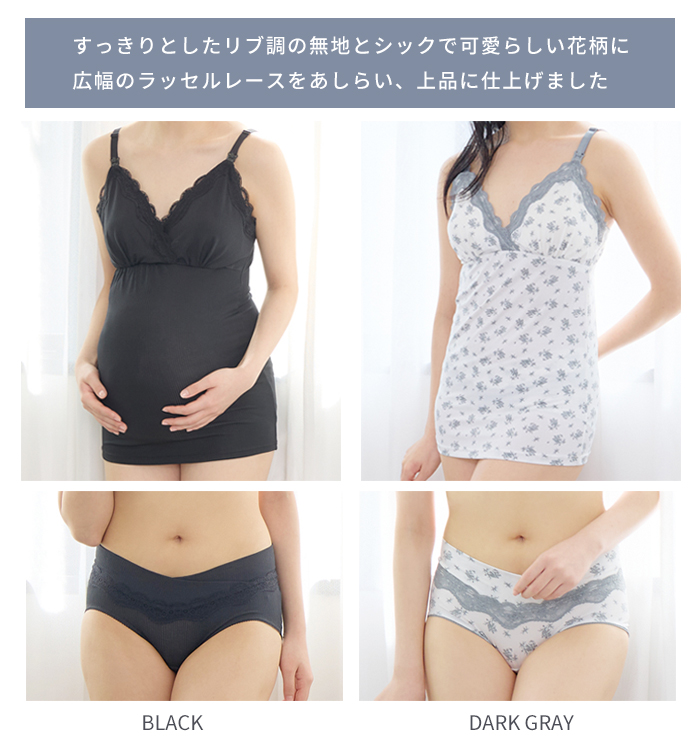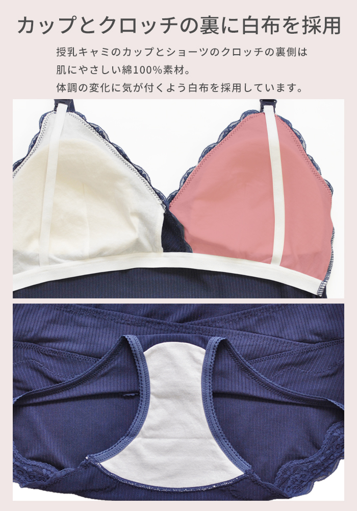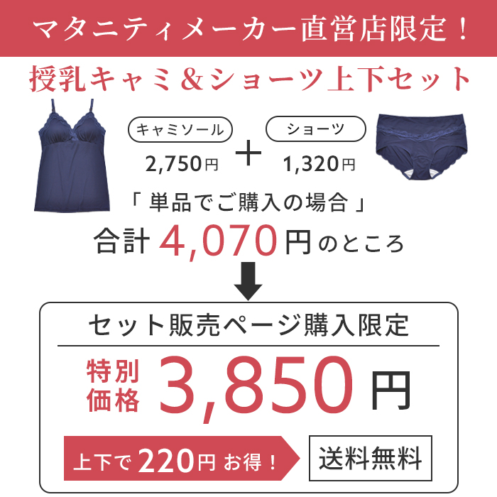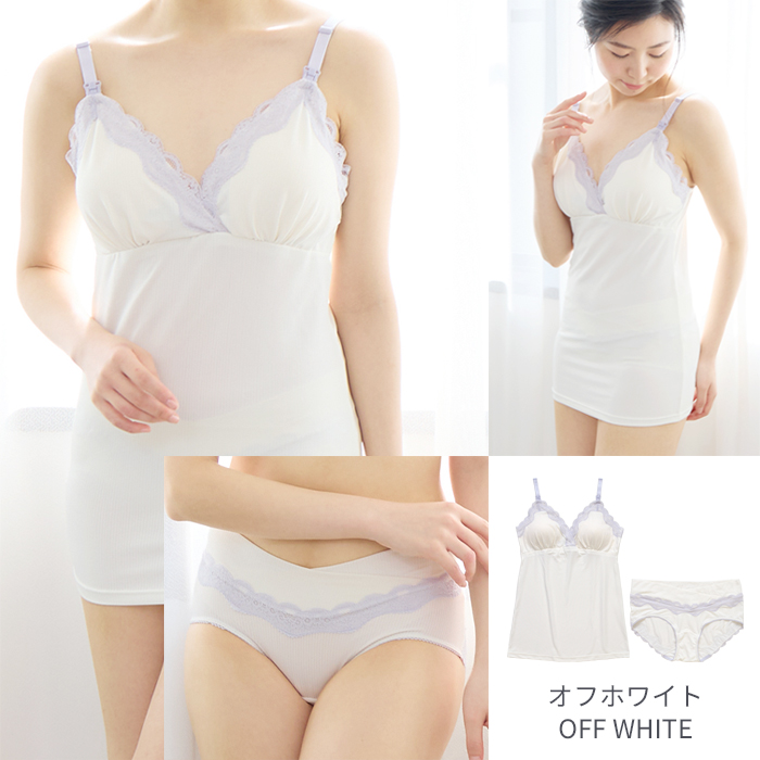 伸縮性の高い天竺素材を使用し、広幅のラッセルレースを贅沢にあしらった授乳キャミとショーツの上下セット。マタニティメーカー直営店限定で単品で購入するよりセットのほうがお買い得です。
