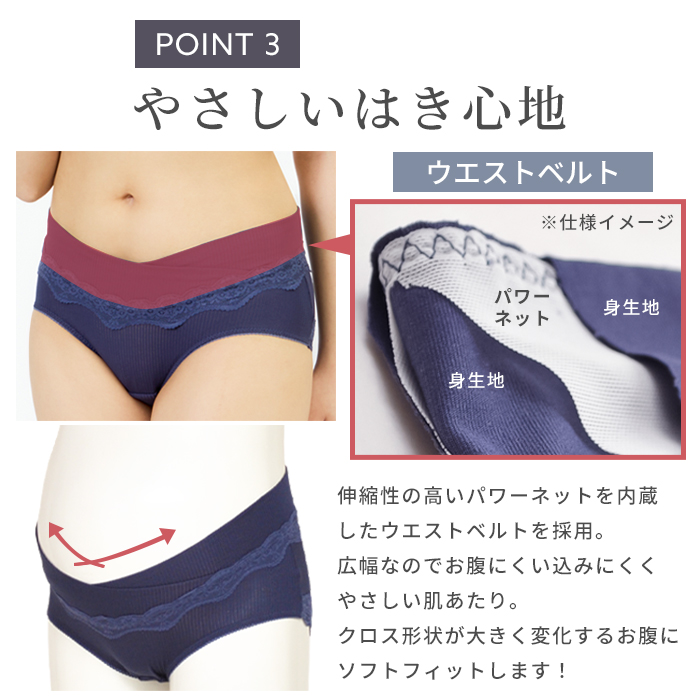 クロス形状のウエストベルトが特徴の産前産後兼用ショーツ。ゴムを使用せずパワーネットを身生地で包んだ広幅のウエストベルトは、大きくなるおなかに面でソフトフィット。身体にやさしい仕様です。浅履きタイプのショーツなので、みぞおちあたりの不快な締めつけから解放され楽ちん。健診のエコー時にもスムーズです。産前・産後と計算されたウエストラインでフロントをすっきり見せ、後はヒップをすっぽり包む安定感のあるバックスタイルです。身生地は、ストレッチ性のあるベア天竺素材なので、産前産後と長く使え、産後も上下コーデを楽しめます。ウエストヒップレースは直接肌に触れにくい生地の上に重ねる仕立てに。見た目も機能も充実なアイテムです。