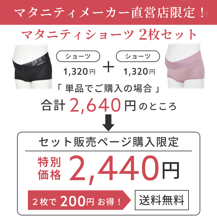 ストレッチ性のあるリブ調の針抜き天竺素材を使用したマタニティショーツの2枚セット。マタニティメーカー直営店限定で単品で購入するよりセットのほうがお買い得です。