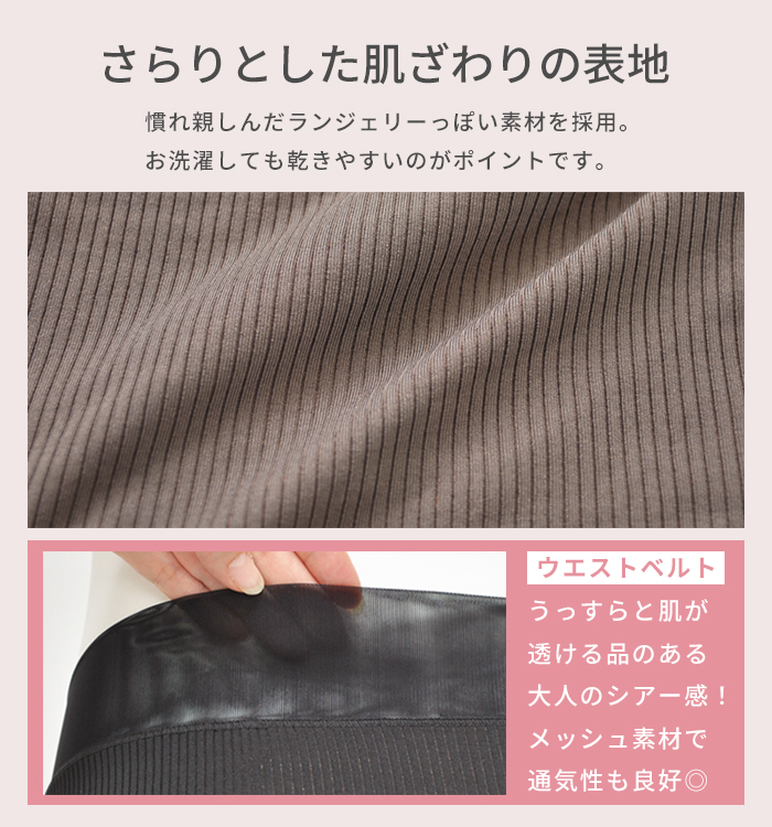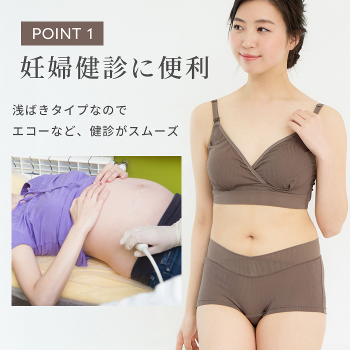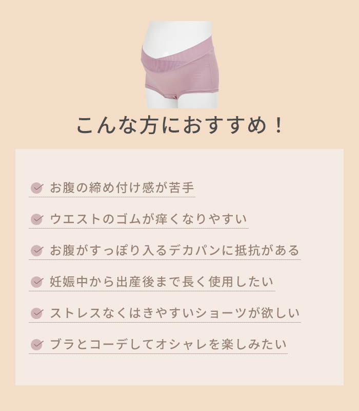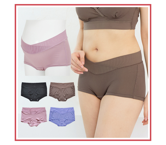ウエストベルトにパワーネットを採用し、部分的にうっすら肌が透ける素材感がシンプルながら品の良い大人っぽさを演出。肌あたりもやさしく、メッシュ素材なので通気性も良好。お洗濯でも乾きやすいのがポイントです。デザインは、ボクサータイプを採用。裾口はゴムなしでらくちんなはき心地。浅履きタイプなので、妊婦検診に便利でエコーの際もスムーズ。広幅のウエストベルトは伸縮性があるので、くいこみにくく面でお腹にやさしくフィット。さらにクロス形状が妊娠中から出産後まで変化するお腹に対応し長くご使用いただけ経済的。計算されたウエストラインの傾斜で前はすっきり、後ろはすっぽり安定のスタイルです。脇の縫製は、縫い代を上から押さえ肌あたりを軽減。洗濯ラベルは直接肌にあたらない位置に縫い付けています。