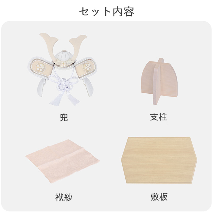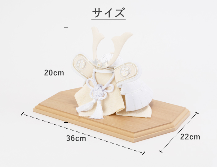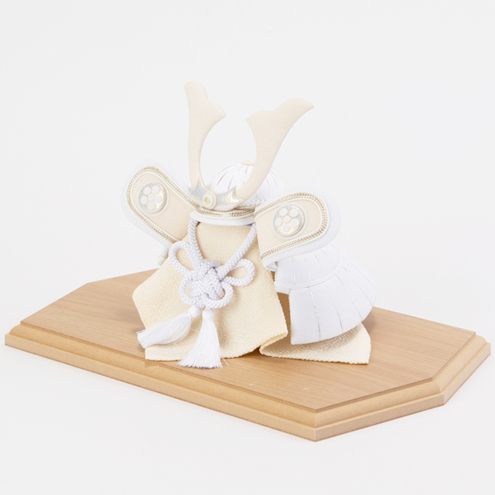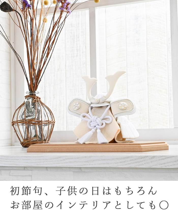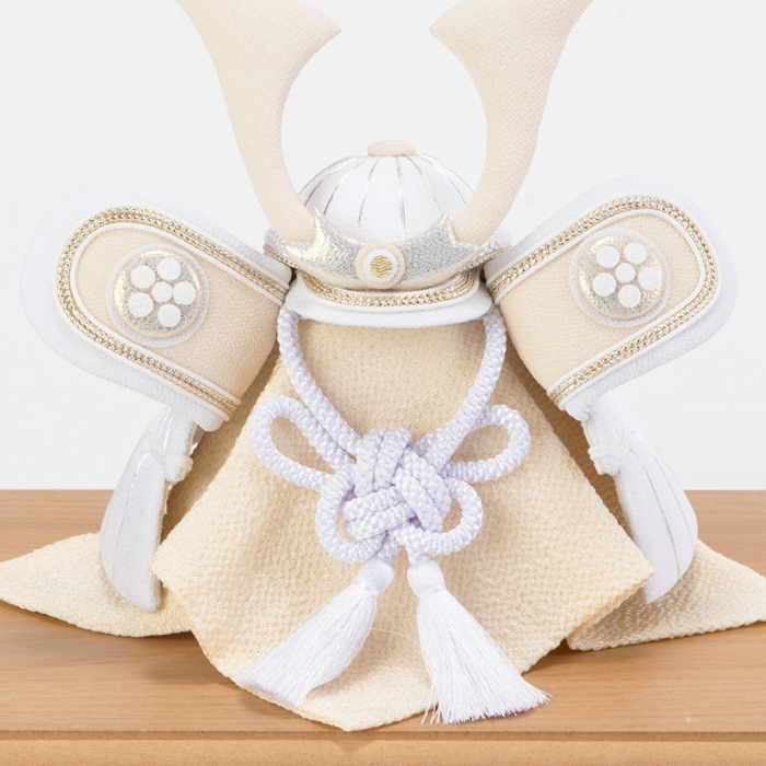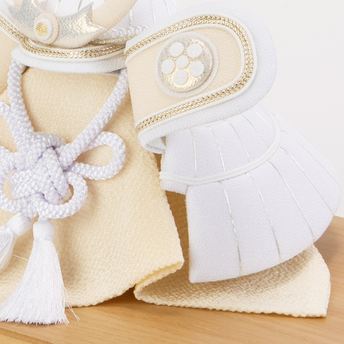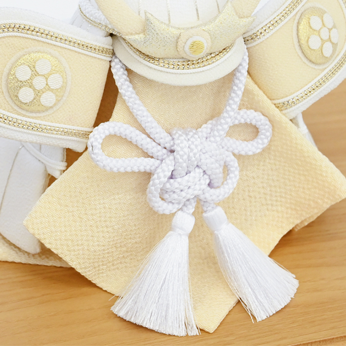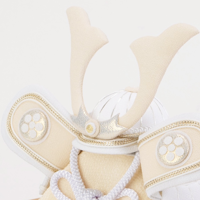 素朴で新しい、白だからこそ表現できる美しさ。白は清らかで神聖な色とされており厄を払い幸福を守る意味合いも含まれます。従来の勇ましい兜飾りにはあまり使用することのなかった白いちりめん生地を使うことで柔らかく優しい印象に。男の子が力強く、そして優しい心を持って成長してくれますようにという願いを込めています。