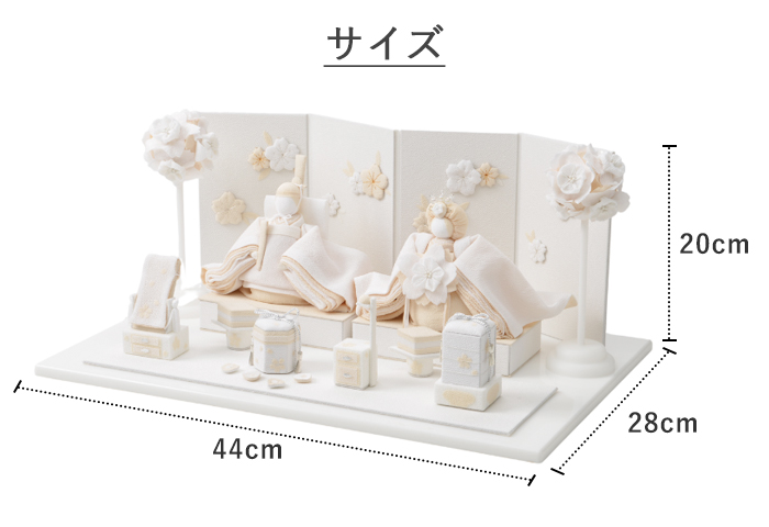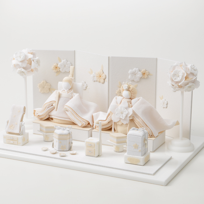 女の子の健やかな成長を願う桃の節句、従来の色鮮やかな雛人形とはちょっと趣向を変えて、親王(お雛様とお内裏様)だけでなく、お道具や屏風、ぼんぼりなど全てを白とベージュでシンプルに仕上げました。