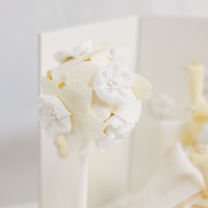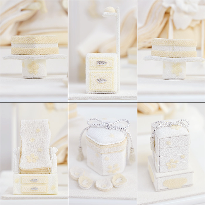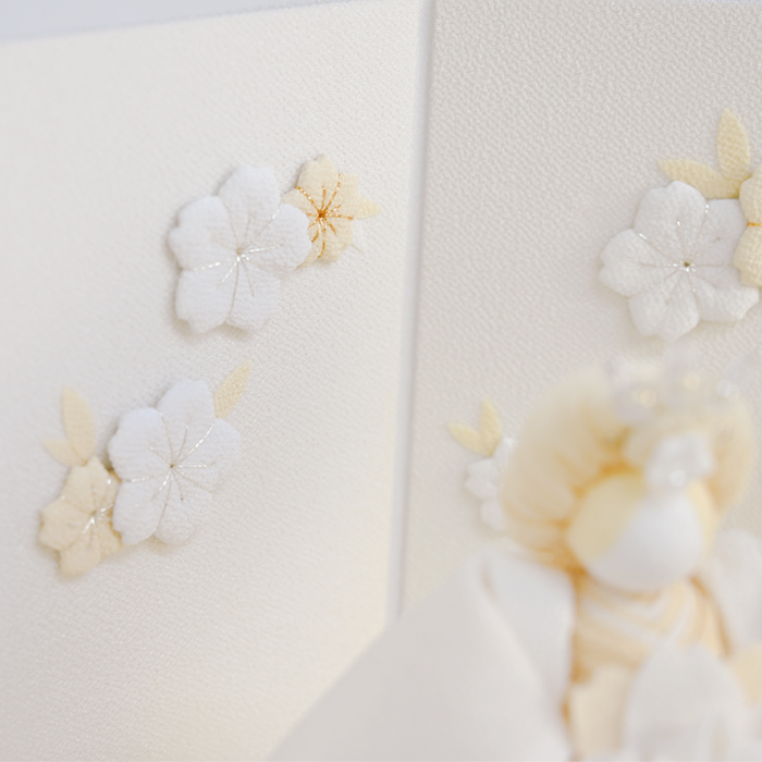 白を基調とした「白粋(HAKI)」あえて色を絞ることで、より布の質感や装飾の陰影が印象的な仕上がりになりました。素朴で新しい白だからこそ表現できる美しさ。白は清らかで神聖な色とされており魔を払い幸福を守る意味合いも含まれます。