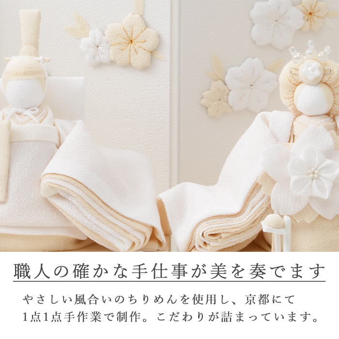 お雛様とお内裏様が着ている着物は十二単の重ねを意識して作られており、実際に京都の職人が一枚一枚丁寧にちりめんを折り重ねて作り上げています。