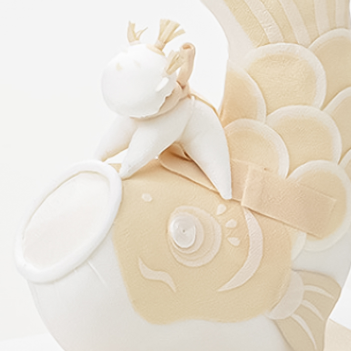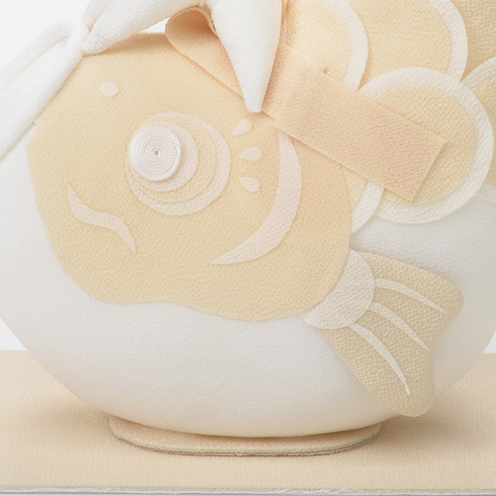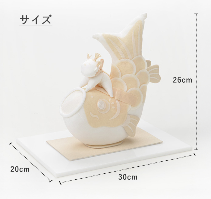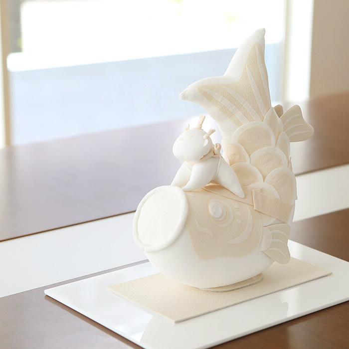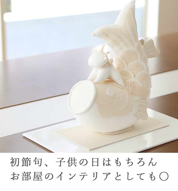 ぷっくりふっくらとした鯉(こい)に乗る元気いっぱいの童(わらべ)がかわいい節句飾り。現代の住空間に馴染むよう白とベージュでまとめたモダンなデザインです。コンパクトサイズなのでこいのぼりが飾りにくいお家でもお気軽にお飾りいただけます。