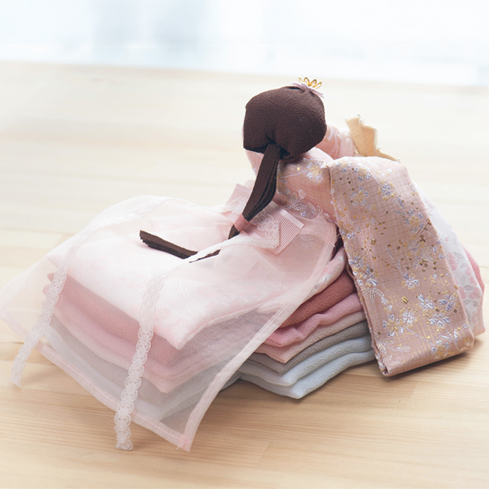 鼻すじ、ふっくらとした頬、耳を表現することで、 陰影が印象的な優しいお顔に仕上がりました。 袖や裾はあえてふっくらとボリュームを持たせ、 柔らかな手触りに仕上げています。