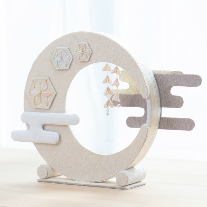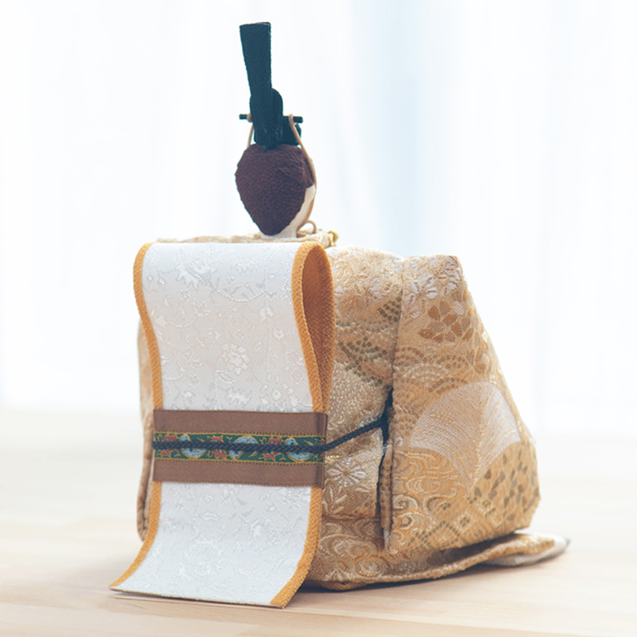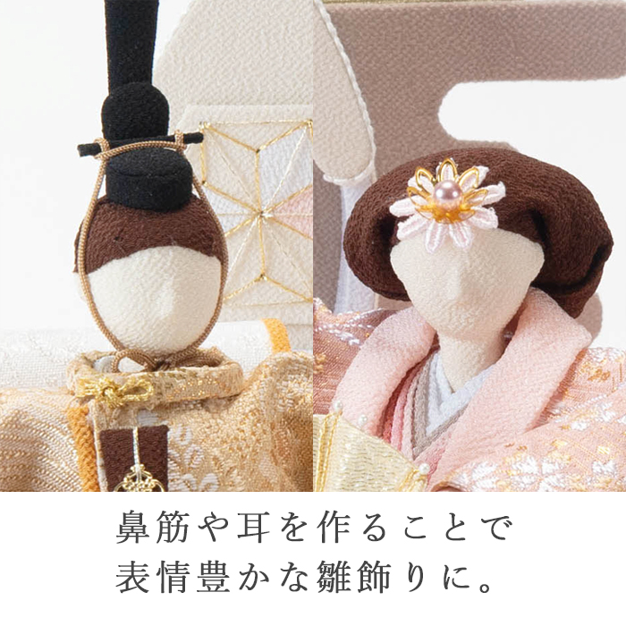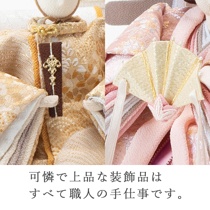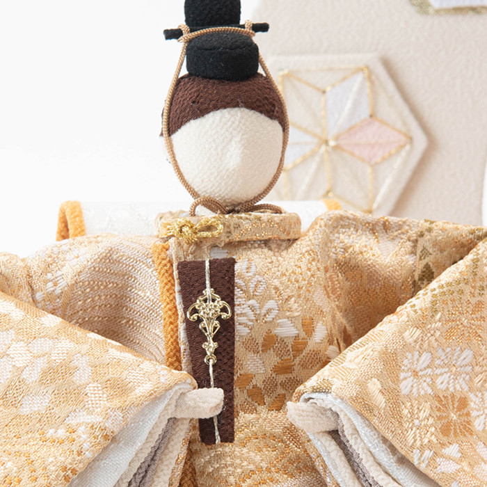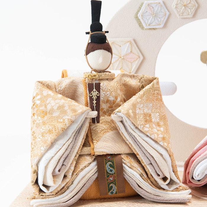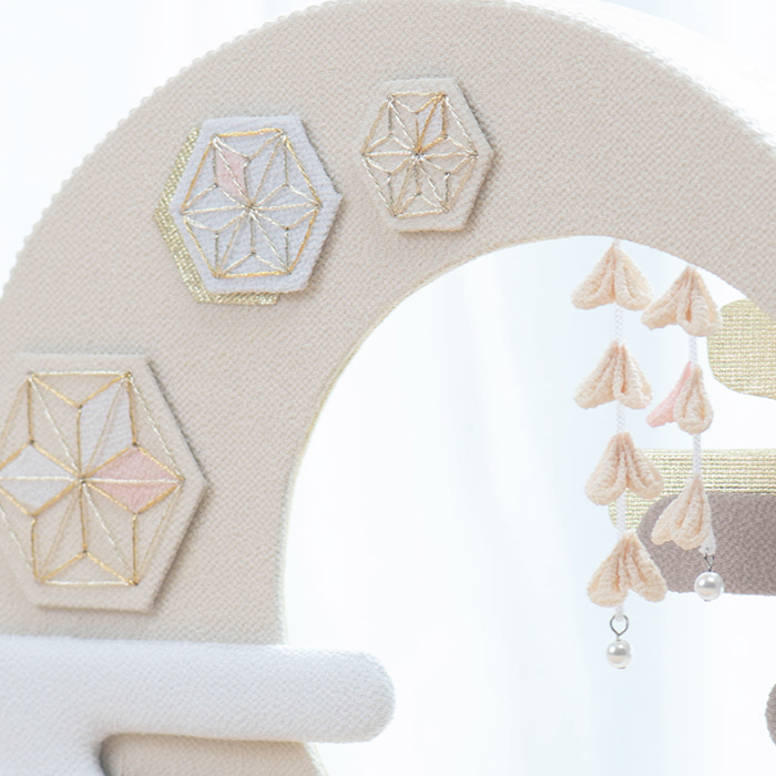 三日月の優美な装飾品と繊細なつまみ細工、襲ね(かさね)の美しさ、 お子様の「健康」「成長」を願って金糸で丁寧に施した麻紋様もお楽しみください。