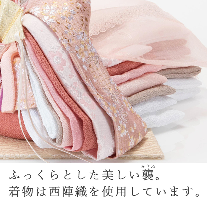 凛とした佇まいでありながら、手に取ると伝わるどっしりとした重厚感。 西陣織の艶やかな光沢が優美な衣装着人形です。