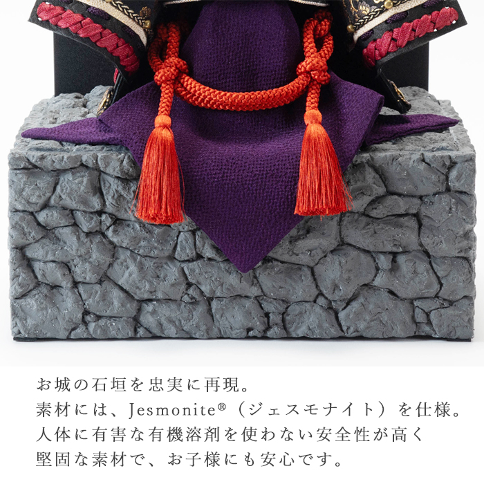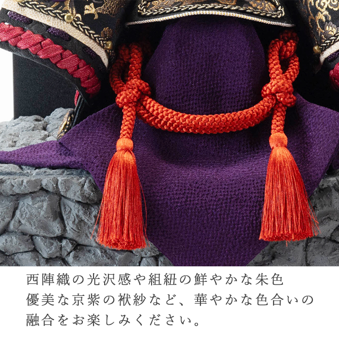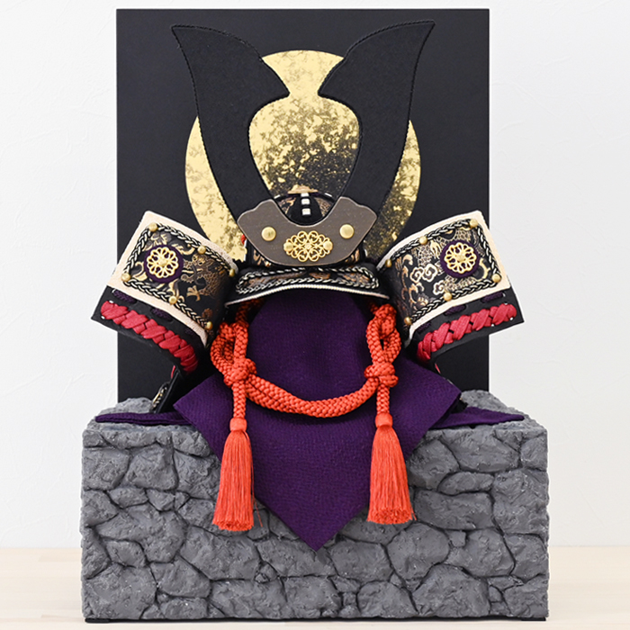 古都京都に所縁のある京紫や朱色を使い、幻の城と言われる「伏見指月城」を彷彿とさせる石垣に力強い兜を合わせました。