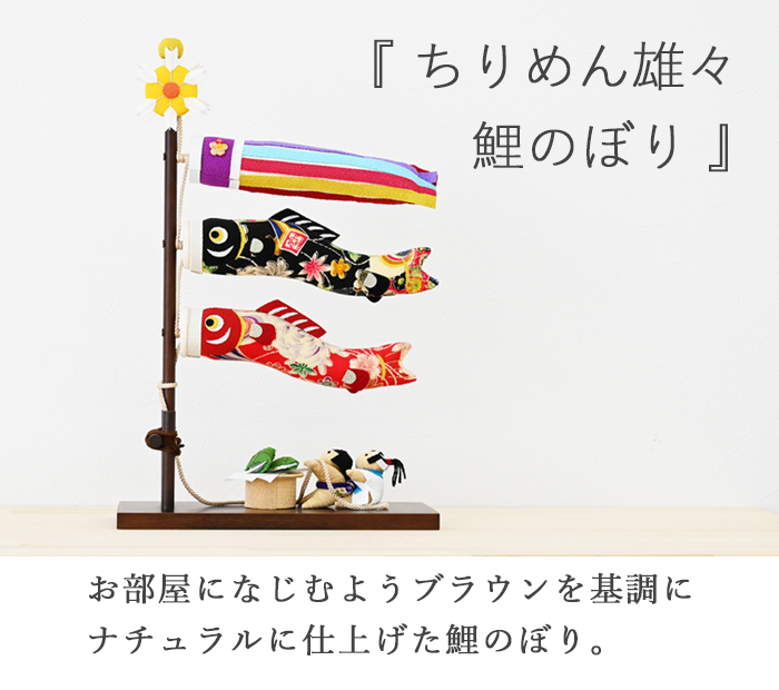 人気の「ちりめん雄々鯉のぼり」を、お部屋になじむようブラウンを基調に、ナチュラルに仕上げました。