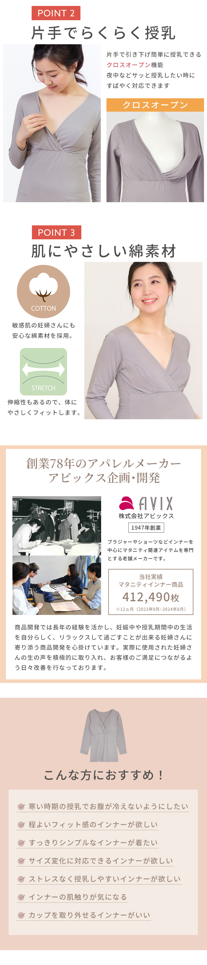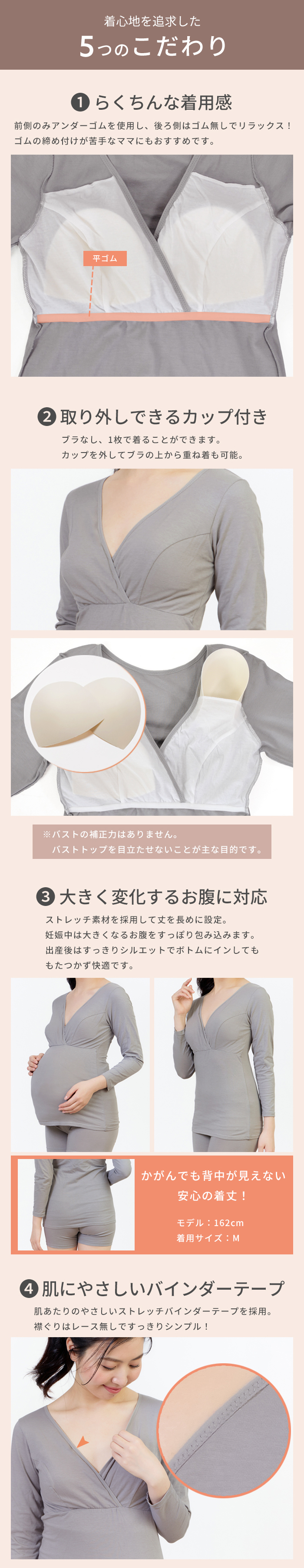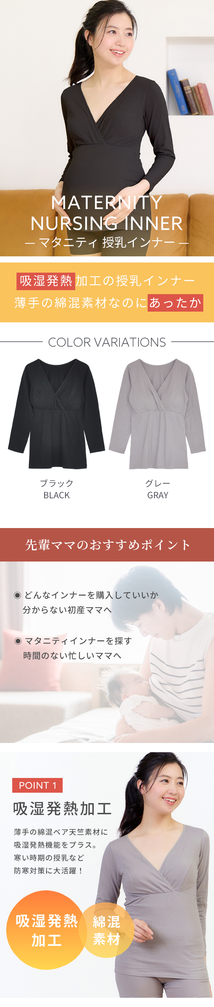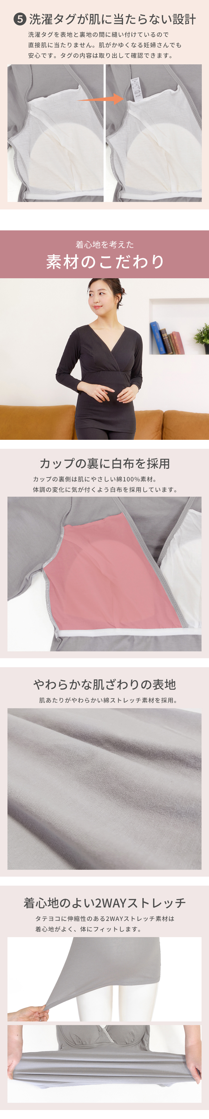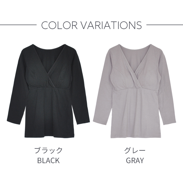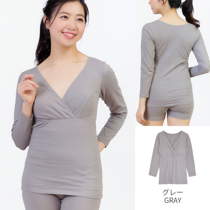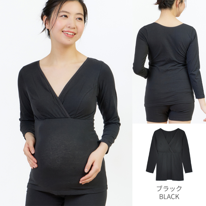 吸湿発熱加工を施した綿ベア天竺素材の9分袖マタニティ授乳インナー。襟ぐりにストレッチバインダーテープを使用したシンプルで使い易いインナーです。授乳機能は、クロスオープン仕様。取り外し可能なカップ付きです。アンダーはフロント部分のみゴムが縫い付けられているので、リラックスした楽ちんな着心地。ストレッチの効いた綿素材なので、身体にやさしくフィットします。臨月も安心な着丈で、すっきりとしたシルエットです。薄手なのにあたたかいので寒い時期の授乳に大活躍。カップを取り外しブラの上から重ね着使いも可能です。
