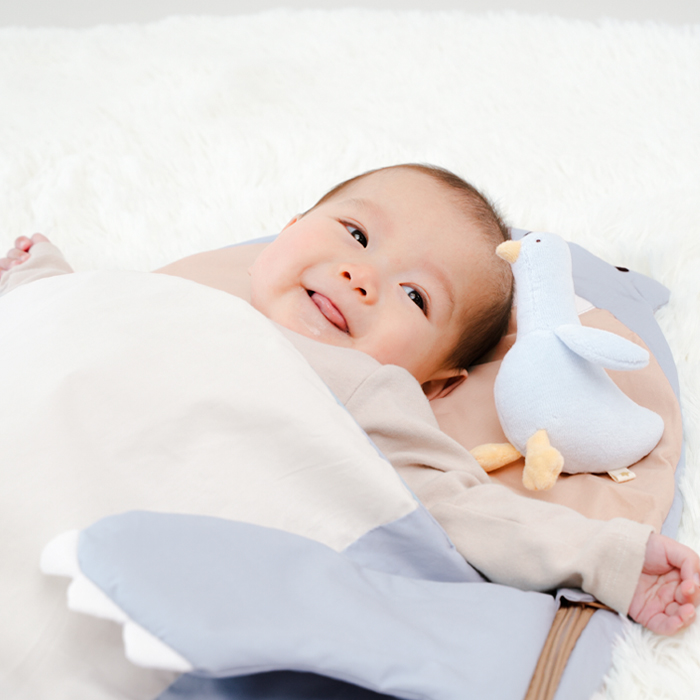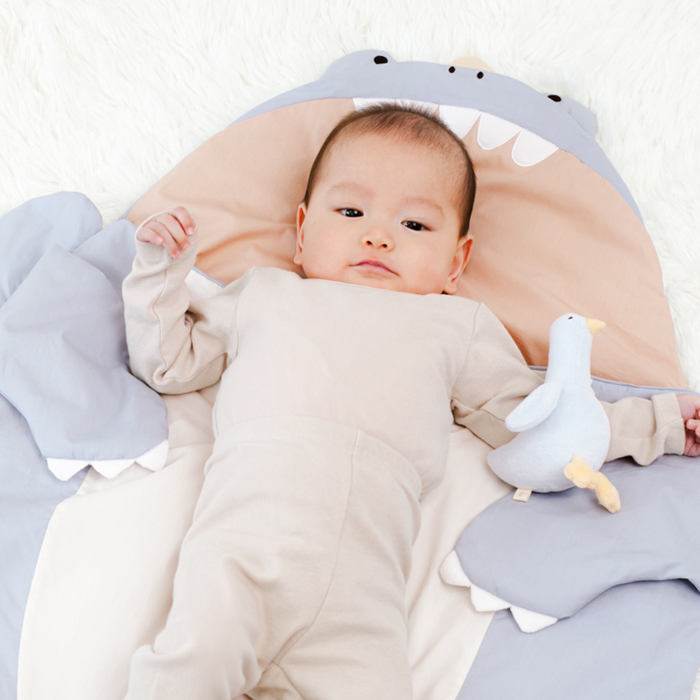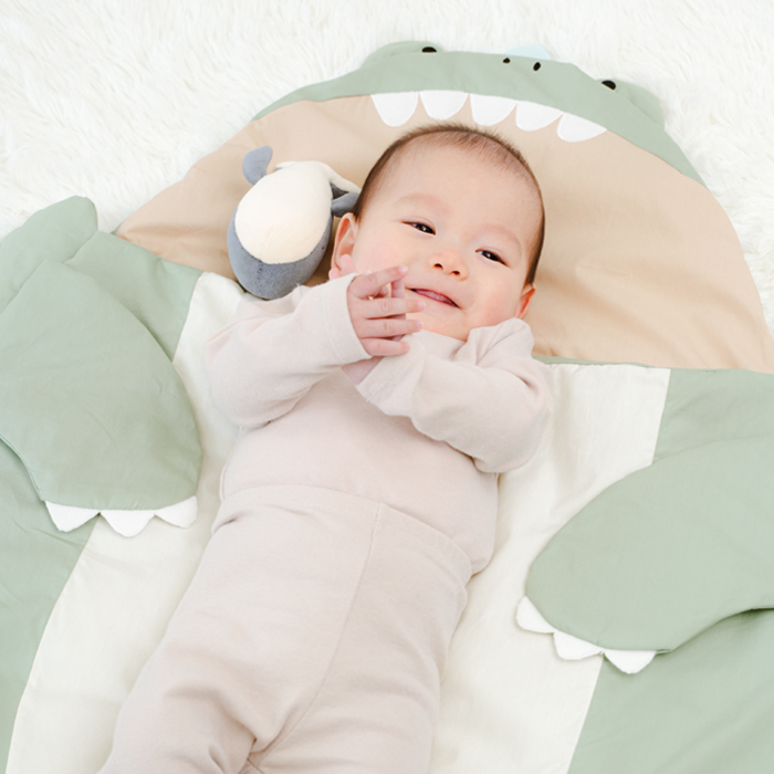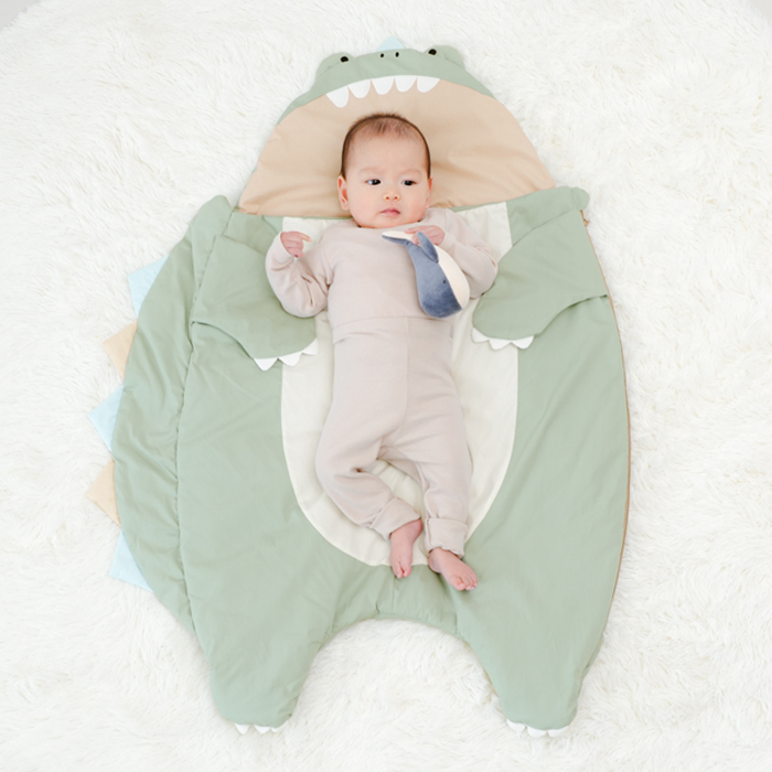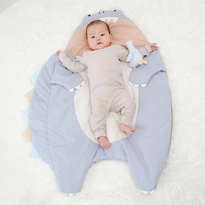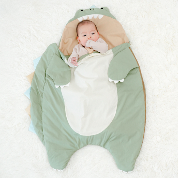 赤ちゃんを抱っこして見える様子に思わずにっこり笑顔になる恐竜のスリーピングバッグ。中に入ればガブっと食べられてる姿に!
