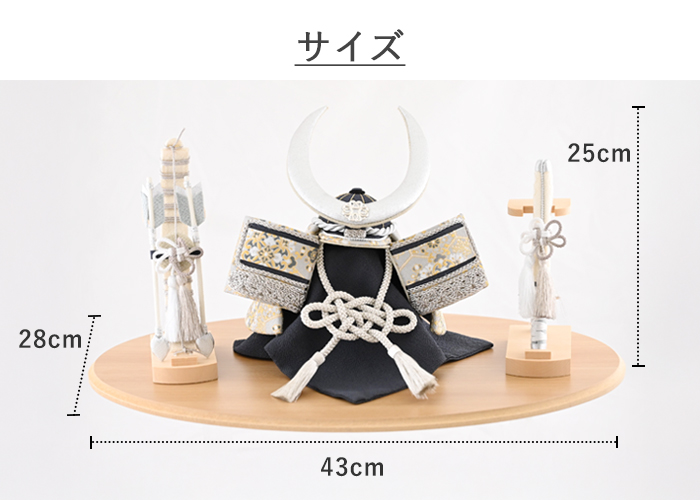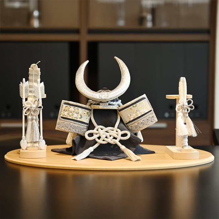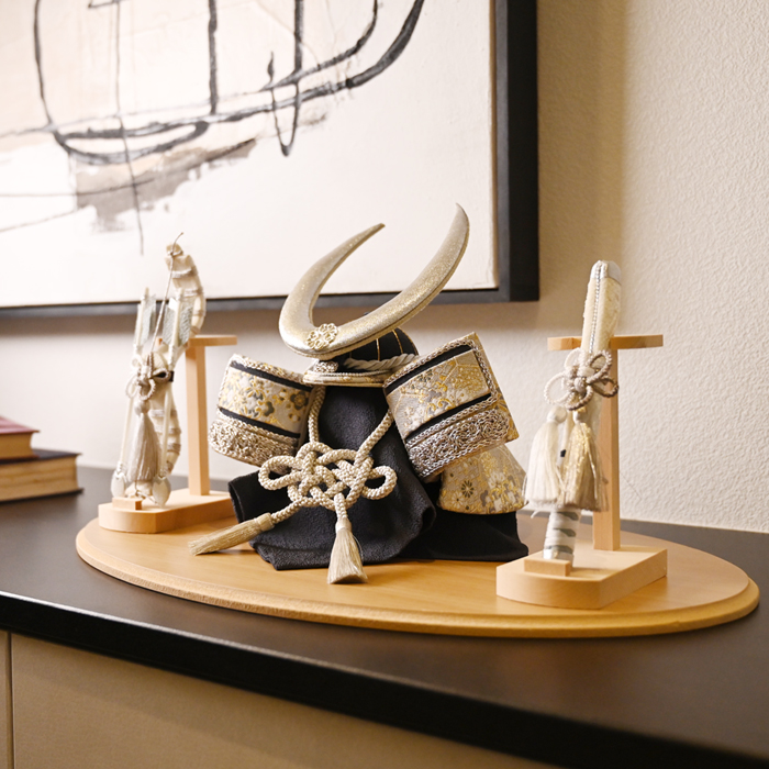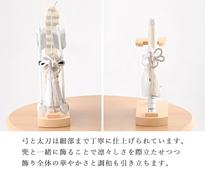 長く伸びた弓は「神様が降りて宿るもの」とされ、神聖な存在を象徴する飾りです。一方、太刀は「人を傷つけない儀式と護身のためのもの」として飾られ、平和への願いが込められています。どちらも「邪気や魔が近寄らないように」という魔除けの意味を持ち、お子様の健やかな成長を願う節句飾りとして、より一層意味深く、美しい佇まいに仕上がりました。