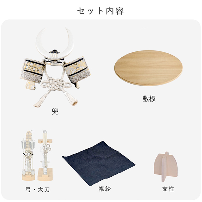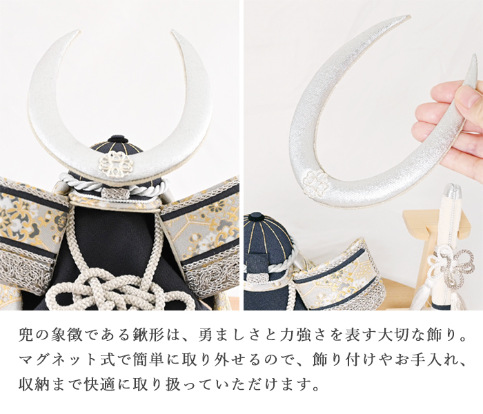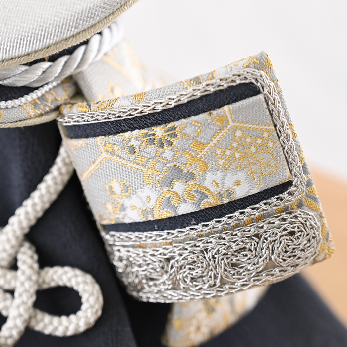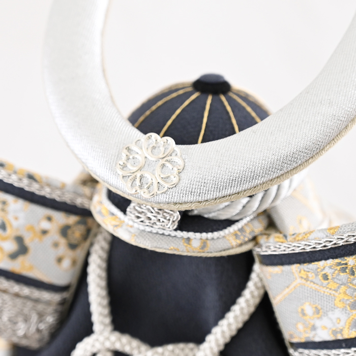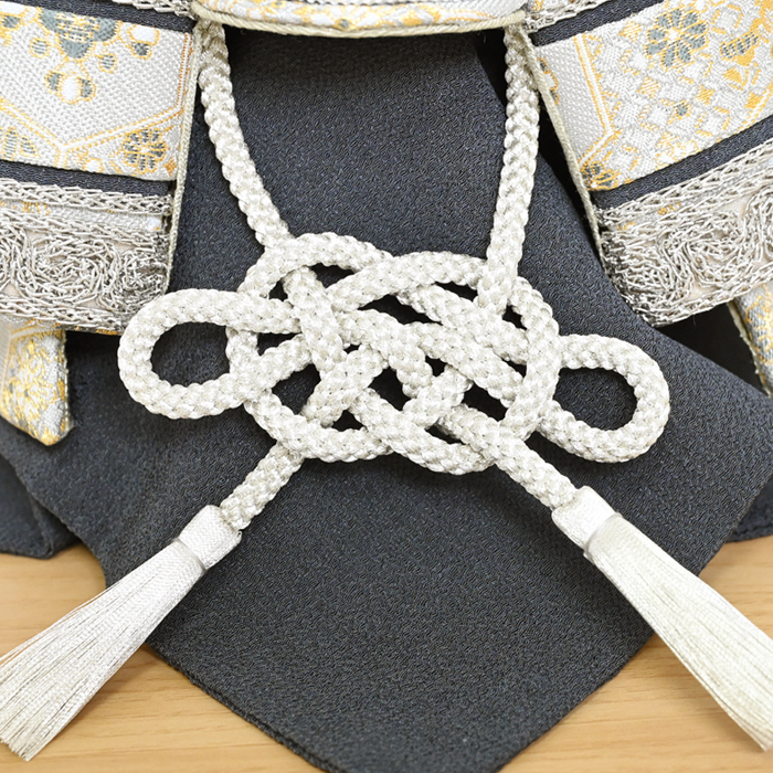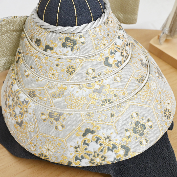 夢み屋オリジナルの金襴生地を使用した、格調高い兜飾り。艶のある白地に織り込まれた金糸が、光を受けて模様を浮かび上がらせ、上品で華やかな印象を与えます。織物の中でも最高位に位置づけられる素材です。