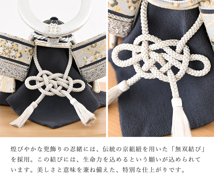 煌びやかな兜飾りの忍緒には、伝統の京組紐を用いた「無双結び」を採用。この結びには、生命力を込めるという願いが込められています。美しさと意味を兼ね備えた、特別な仕上がりです。