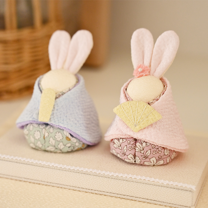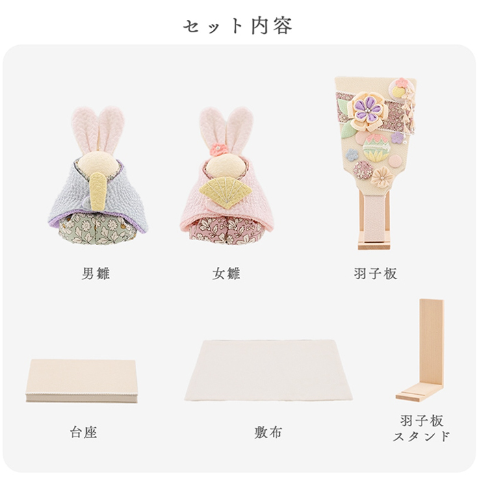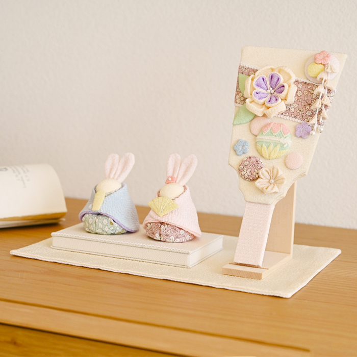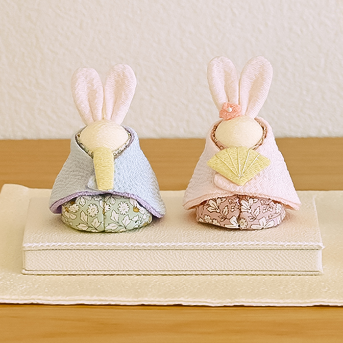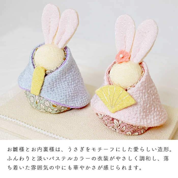 お雛様とお内裏様は、うさぎをモチーフにした愛らしい造形。ふんわりと淡いパステルカラーの衣装がやさしく調和し、落ち着いた雰囲気の中にも華やかさが感じられます。動物モチーフならではの親しみやすさがあり、お子様にも喜ばれるデザインです。