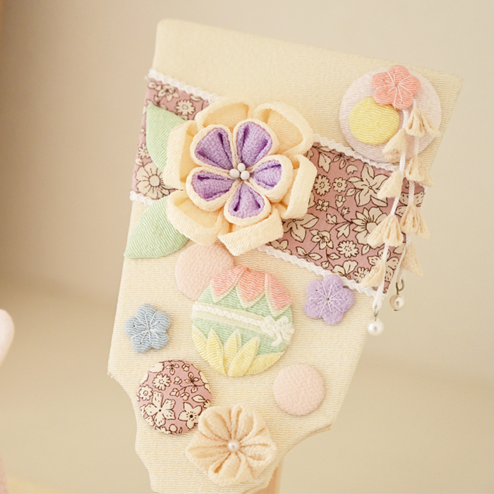 コットンとちりめんを組み合わせた、やさしいくすみカラーの雛人形。淡いピンクやベージュの色合いが、空間に自然と馴染みながらも、お子様の初節句をやさしく彩ります。見た目にも柔らかく、上品な印象です。
