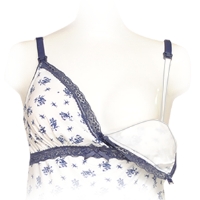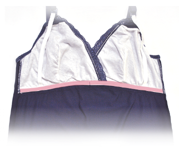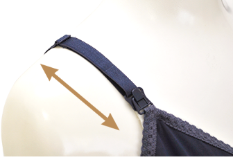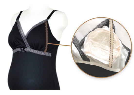 授乳時バストを開閉した際、ストラップが肩からずり落ちないよう開閉用バックルとアンダー部分をゴムでつなげています。そのゴムの内側に母乳パッドを装着するとパッドが安定します。